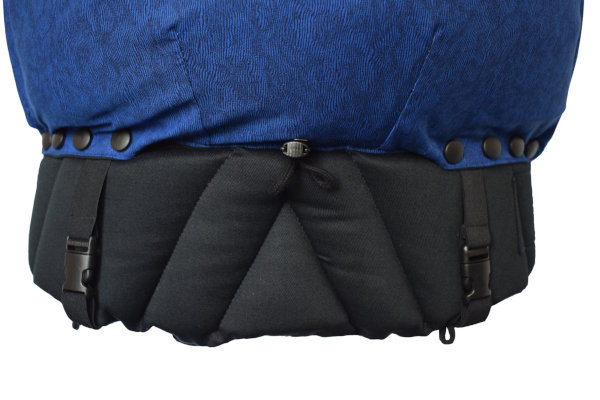 At the top, the backrest is loosely attached to the shoulder straps – this allows it to be pulled up or down continuously according to the actual need. If the baby falls asleep, you simply pull the backrest up to the top of the head to secure it against sudden recline. The backrest can be secured at the desired height using the sewn-in carabiners. The minimum height of the backrest is approx. 33 cm, the maximum approx. 56 cm.